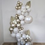 Prestižna kombinacija perl balonov v bež / ivory / zlati barvi ustvarja luksuzno, mehko in nežno postavitev, ki je popolna kot ozadje za fotografije in dekor glavnega kotička dogodka.