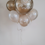 Personaliziran balonski šopek v toplih zlatih in šampanjskih odtenkih je čudovita izbira za rojstni dan, obletnico, baby shower, krst, poroko ali katerokoli posebno priložnost.